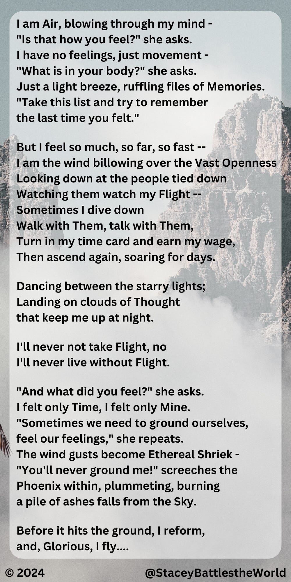 I am Air, blowing through my mind - "Is that how you feel?" she asks. I have no feelings, just movement - "What is in your body?" she asks. Just a light breeze, ruffling files of Memories. "Take this list and try to remember the last time you felt." But I feel so much, so far, so fast -- I am the wind billowing over the Vast Openness Looking down at the people tied down Watching them watch my Flight -- Sometimes I dive down Walk with Them, talk with Them, Turn in my time card and earn my wage, Then ascend again, soaring for days. Dancing between the starry lights; Landing on clouds of Thought that keep me up at night. I'll never not take Flight, no I'll never live without Flight. "And what did you feel?" she asks. I felt only Time, I felt only Mine. "Sometimes we need to ground ourselves, feel our feelings," she repeats. The wind gusts become Ethereal Shriek - "You'll never ground me!" screeches the Phoenix within, plummeting, burning a pile of ashes falls from the Sky. Before it hits the ground, I reform, and, Glorious, I fly.... ©2024 @StaceyBattlestheWorld