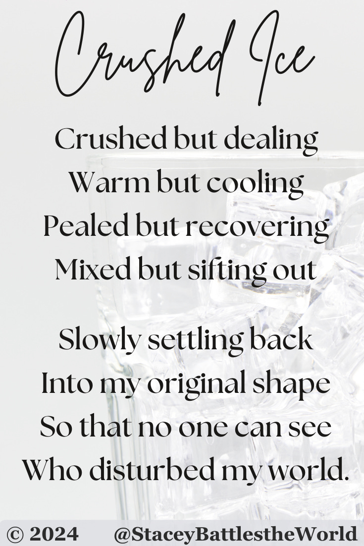 Crushed Ice"....Who disturbed my world."Jun 21, 2024ShareCrushed IceText within this block will maintain its original spacing when publishedCrushed but dealing Warm but cooling Pealed but recovering Mixed but sifting out Slowly settling back Into my original shape So that no one can see Who disturbed my world. ©2024 @StaceyBattlestheWorldThanks for reading Stacey Battles the World! Subscribe for free to receive new posts and support my work.SubscribePreviousNext