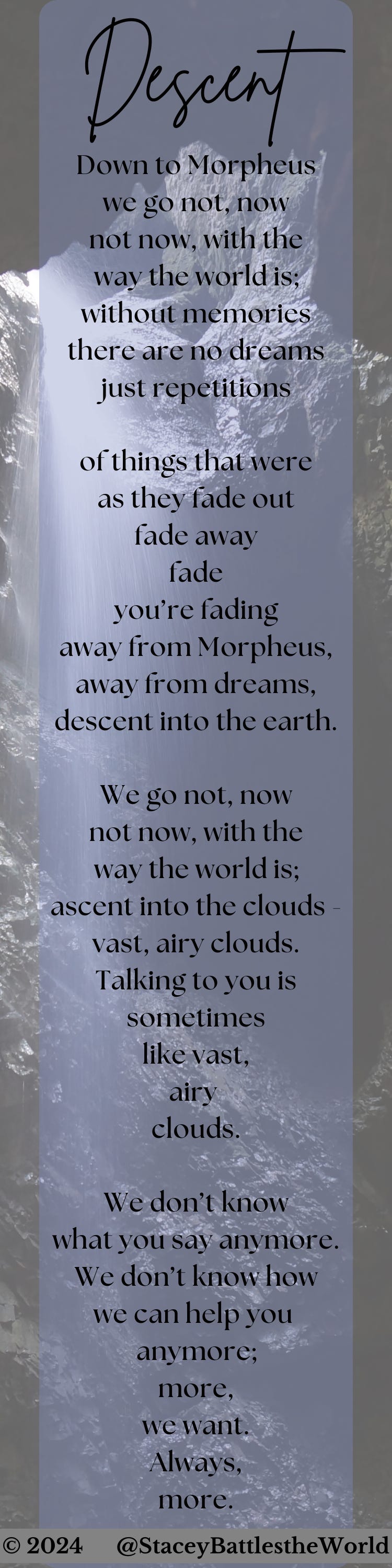 Down to Morpheus we go not, now not now, with the way the world is; without memories there are no dreams just repetitions of things that were as they fade out fade away fade you’re fading away from Morpheus, away from dreams, descent into the earth. We go not, now not now, with the way the world is; ascent into the clouds - vast, airy clouds. Talking to you is sometimes like vast, airy clouds. We don’t know what you say anymore. We don’t know how we can help you anymore; more, we want. Always, more. © 2024 @StaceyBattlestheWorld