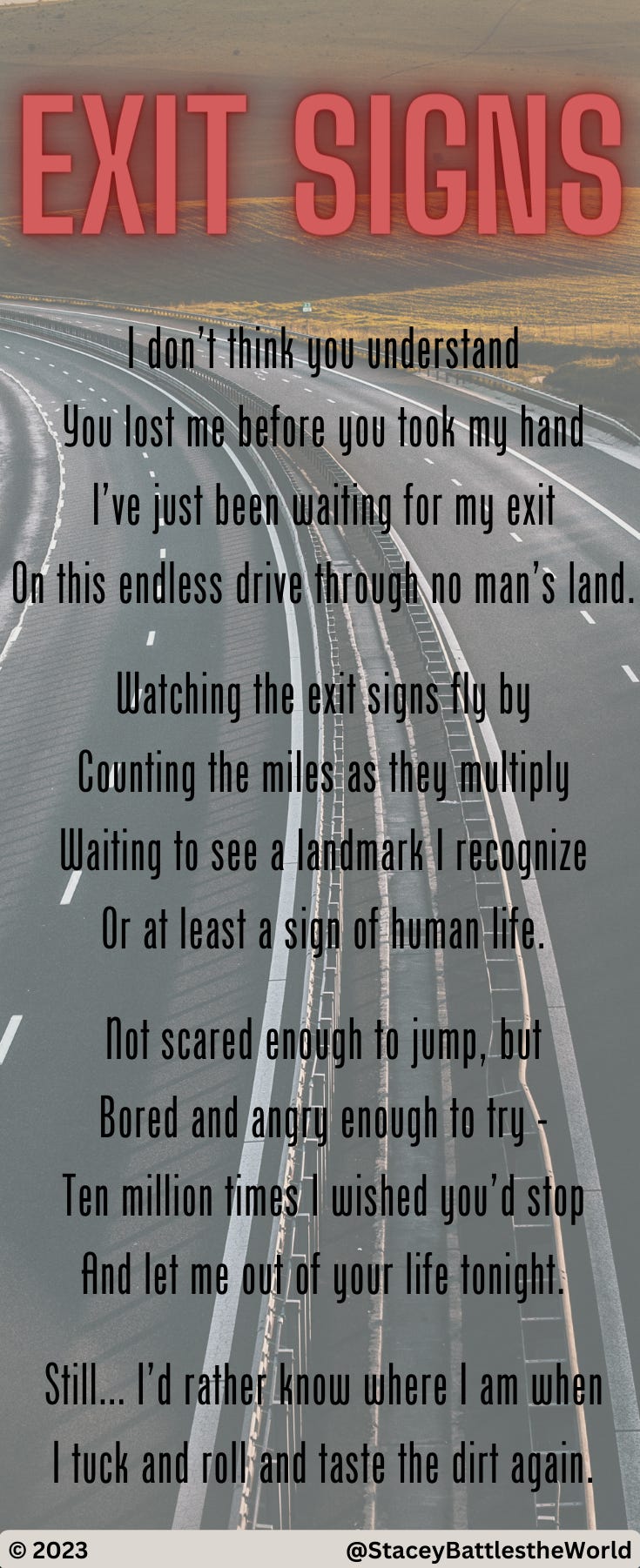 I don’t think you understand You lost me before you took my hand I’ve just been waiting for my exit On this endless drive through no man’s land. Watching the exit signs fly by Counting the miles as they multiply Waiting to see a landmark I recognize Or at least a sign of human life. Not scared enough to jump, but Bored and angry enough to try - Ten million times I wished you’d stop And let me out of your life tonight. Still… I’d rather know where I am when I tuck and roll and taste the dirt again. ©2024 @StaceyBattlestheWorld