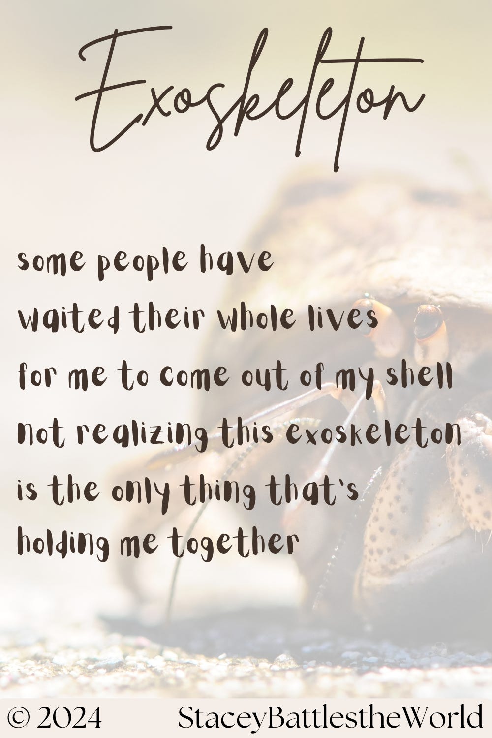 Exoskeleton"Some people have waited their whole lives...."Sep 28, 2024ShareExoskeletonText within this block will maintain its original spacing when publishedsome people have waited their whole lives for me to come out of my shell not realizing this exoskeleton is the only thing that's holding me together ©2024 @StaceyBattlestheWorldThanks for reading Stacey Battles the World! Subscribe for free to receive new posts and support my work.SubscribePreviousNext