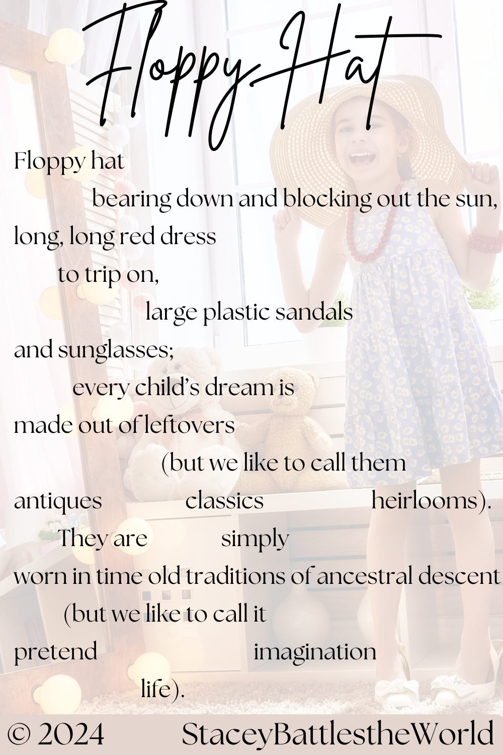 Floppy hat bearing down and blocking out the sun, long, long red dress to trip on, large plastic sandals and sunglasses; every child's dream is made out of leftovers (but we like to call them antiques classics heirlooms). They are simply worn in time old traditions of ancestral descent (but we like to call it pretend imagination life).