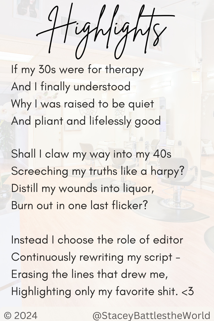 If my 30s were for therapy And I finally understood Why I was raised to be quiet And pliant and lifelessly good Shall I claw my way into my 40s Screeching my truths like a harpy? Distill my wounds into liquor, Burn out in one last flicker? Instead I choose the role of editor Continuously rewriting my script - Erasing the lines that drew me, Highlighting only my favorite shit. <3 © 2024 @StaceyBattlestheWorld