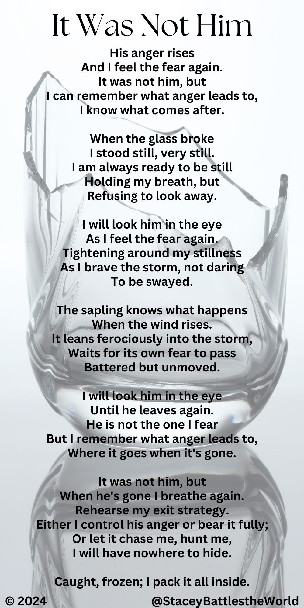 His anger rises And I feel the fear again. It was not him, but I can remember what anger leads to, I know what comes after. When the glass broke I stood still, very still. I am always ready to be still - Holding my breath, but Refusing to look away. I will look him in the eye As I feel the fear again. Tightening around my stillness As I brave the storm, not daring To be swayed. The sapling knows what happens When the wind rises. It leans ferociously into the storm, Waits for its own fear to pass Battered but unmoved. I will look him in the eye Until he leaves again. He is not the one I fear But I remember what anger leads to, Where it goes when it's gone. It was not him, but When he's gone I breathe again. Rehearse my exit strategy. Either I control his anger or bear it fully; Or let it chase me, hunt me, I will have nowhere to hide. Caught, frozen; I pack it all inside. ©2024 @StaceyBattlestheWorld