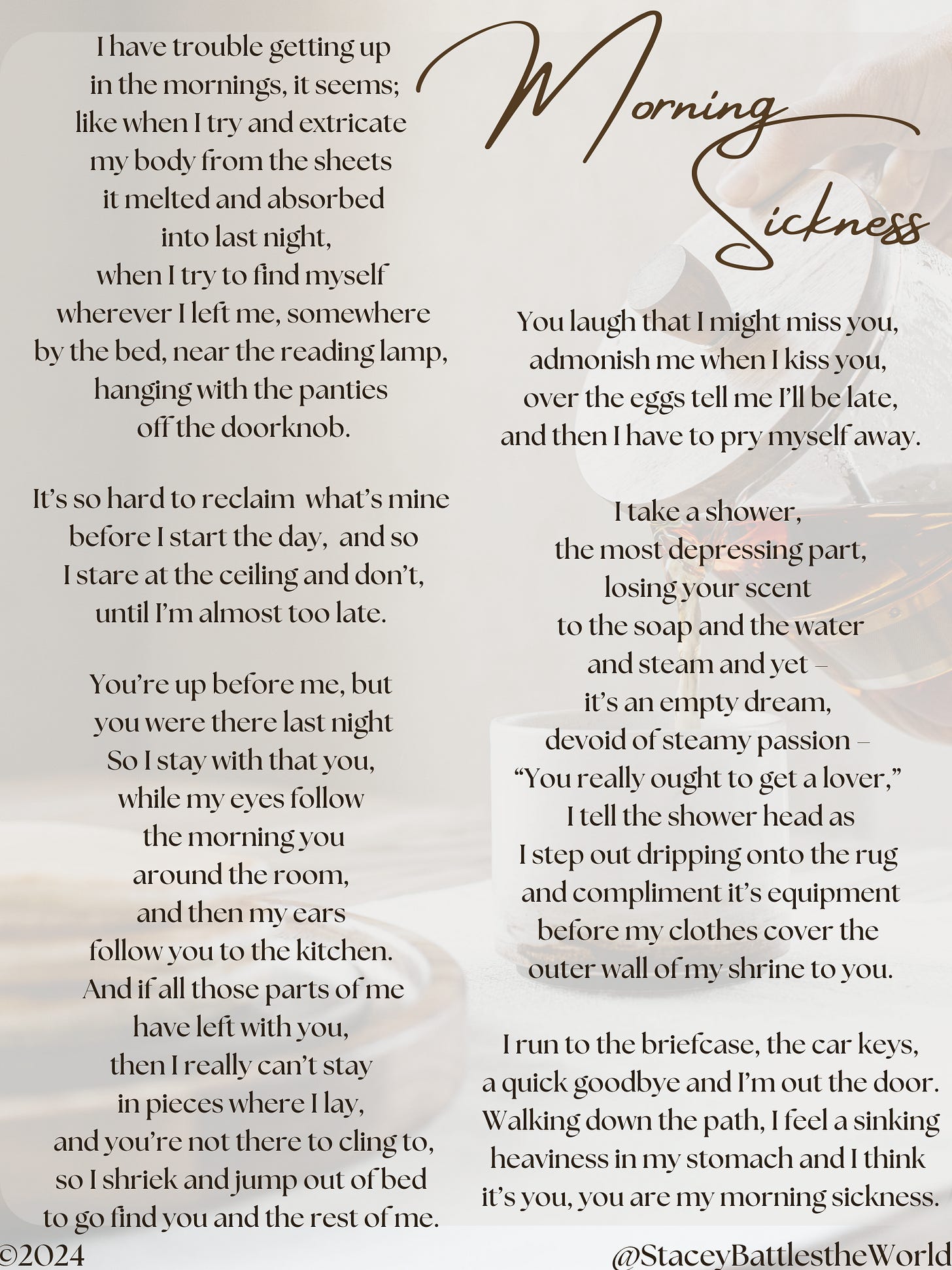 I have trouble getting up in the mornings, it seems; like when I try and extricate my body from the sheets it melted and absorbed into last night, when I try to find myself wherever I left me, somewhere by the bed, near the reading lamp, hanging with the panties off the doorknob. It’s so hard to reclaim what’s mine before I start the day, and so I stare at the ceiling and don’t, until I’m almost too late. You’re up before me, but you were there last night So I stay with that you, while my eyes follow the morning you around the room, and then my ears follow you to the kitchen. And if all those parts of me have left with you, then I really can’t stay in pieces where I lay, and you’re not there to cling to, so I shriek and jump out of bed to go find you and the rest of me You laugh that I might miss you, admonish me when I kiss you, over the eggs tell me I’ll be late, and then I have to pry myself away. I take a shower, the most depressing part, losing your scent to the soap and the water and steam and yet – it’s an empty dream, devoid of steamy passion – “You really ought to get a lover,” I tell the shower head as I step out dripping onto the rug and compliment it’s equipment before my clothes cover the outer wall of my shrine to you. I run to the briefcase, the car keys, a quick goodbye and I’m out the door. Walking down the path, I feel a sinking heaviness in my stomach and I think it’s you, you are my morning sickness. ©2024 @StaceyBattlestheWorld