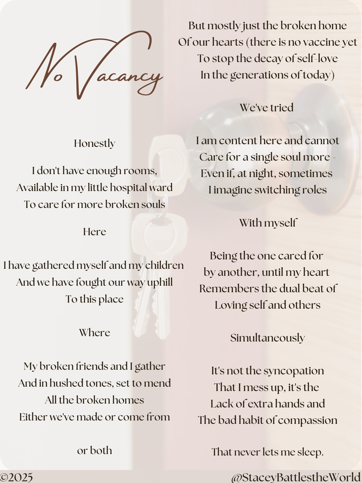 Honestly I don't have enough rooms, Available in my little hospital ward To care for more broken souls Here I have gathered myself and my children And we have fought our way uphill To this place Where My broken friends and I gather And in hushed tones, set to mend All the broken homes Either we've made or come from or both But mostly just the broken home Of our hearts (there is no vaccine yet To stop the decay of self-love In the generations of today) We've tried I am content here and cannot Care for a single soul more - Even if, at night, sometimes I imagine switching roles With myself Being the one cared for by another, until my heart Remembers the dual beat of Loving self and others Simultaneously It's not the syncopation That I mess up, it's the Lack of extra hands and The bad habit of compassion That never lets me sleep. © 2025 @StaceyBattlestheWorld
