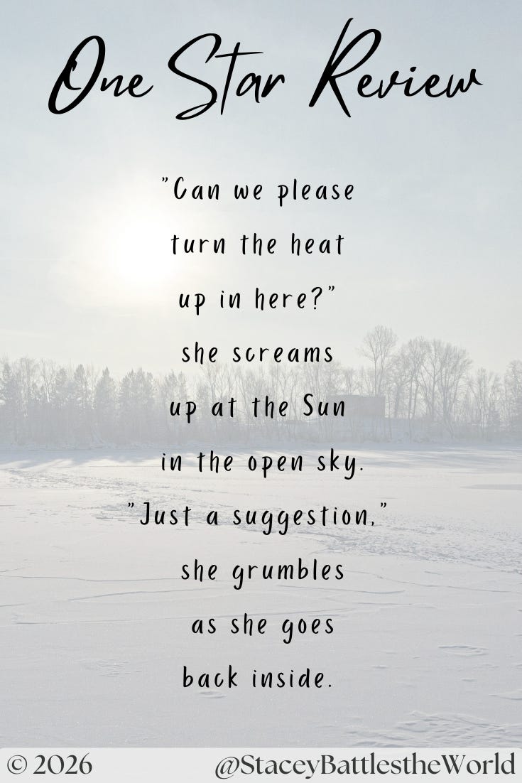 One Star Review"...she screams up at the Sun...."Feb 16, 2026ShareOne Star ReviewText within this block will maintain its original spacing when published"Can we please turn the heat up in here?" she screams up at the Sun in the open sky. "Just a suggestion," she grumbles as she goes back inside. © 2026 @StaceyBattlestheWorldLeave a commentThanks for reading Stacey Battles the World! This post is public so feel free to share it.SharePrevious