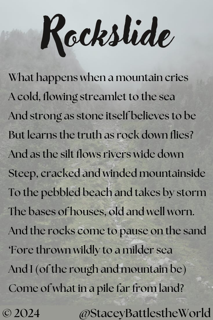 What happens when a mountain cries A cold, flowing streamlet to the sea And strong as stone itself believes to be But learns the truth as rock down flies? And as the silt flows rivers wide down Steep, cracked and winded mountainside To the pebbled beach and takes by storm The bases of houses, old and well worn. And the rocks come to pause on the sand ‘Fore thrown wildly to a milder sea And I (of the rough and mountain be) Come of what in a pile far from land? © 2024 @StaceyBattlestheWorld