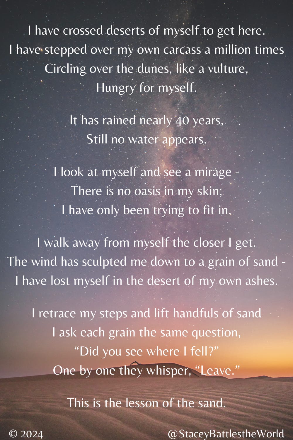 I have crossed deserts of myself to get here. I have stepped over my own carcass a million times Circling over the dunes, like a vulture, Hungry for myself. It has rained nearly 40 years, Still no water appears. I look at myself and see a mirage - There is no oasis in my skin; I have only been trying to fit in. I walk away from myself the closer I get. The wind has sculpted me down to a grain of sand - I have lost myself in the desert of my own ashes. I retrace my steps and lift handfuls of sand I ask each grain the same question, “Did you see where I fell?” One by one they whisper, “Leave.” This is the lesson of the sand. ©2024 @StaceyBattlestheWorld