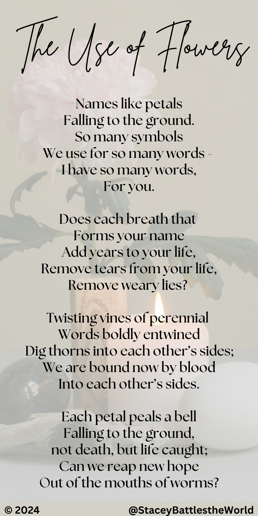 Names like petals Falling to the ground. So many symbols We use for so many words - I have so many words, For you. Does each breath that Forms your name Add years to your life, Remove tears from your life, Remove weary lies? Twisting vines of perennial Words boldly entwined Dig thorns into each other’s sides; We are bound now by blood Into each other’s sides. Each petal peals a bell Falling to the ground, not death, but life caught; Can we reap new hope Out of the mouths of worms? ©2024 @StaceyBattlestheWorld