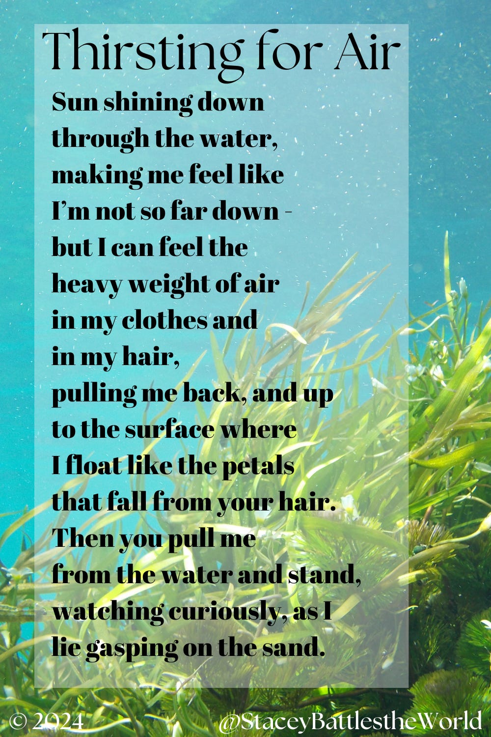 Sun shining down through the water, making me feel like I’m not so far down - but I can feel the heavy weight of air in my clothes and in my hair, pulling me back, and up to the surface where I float like the petals that fall from your hair. Then you pull me from the water and stand, watching curiously, as I lie gasping on the sand. ©2024 @StaceyBattlestheWorld