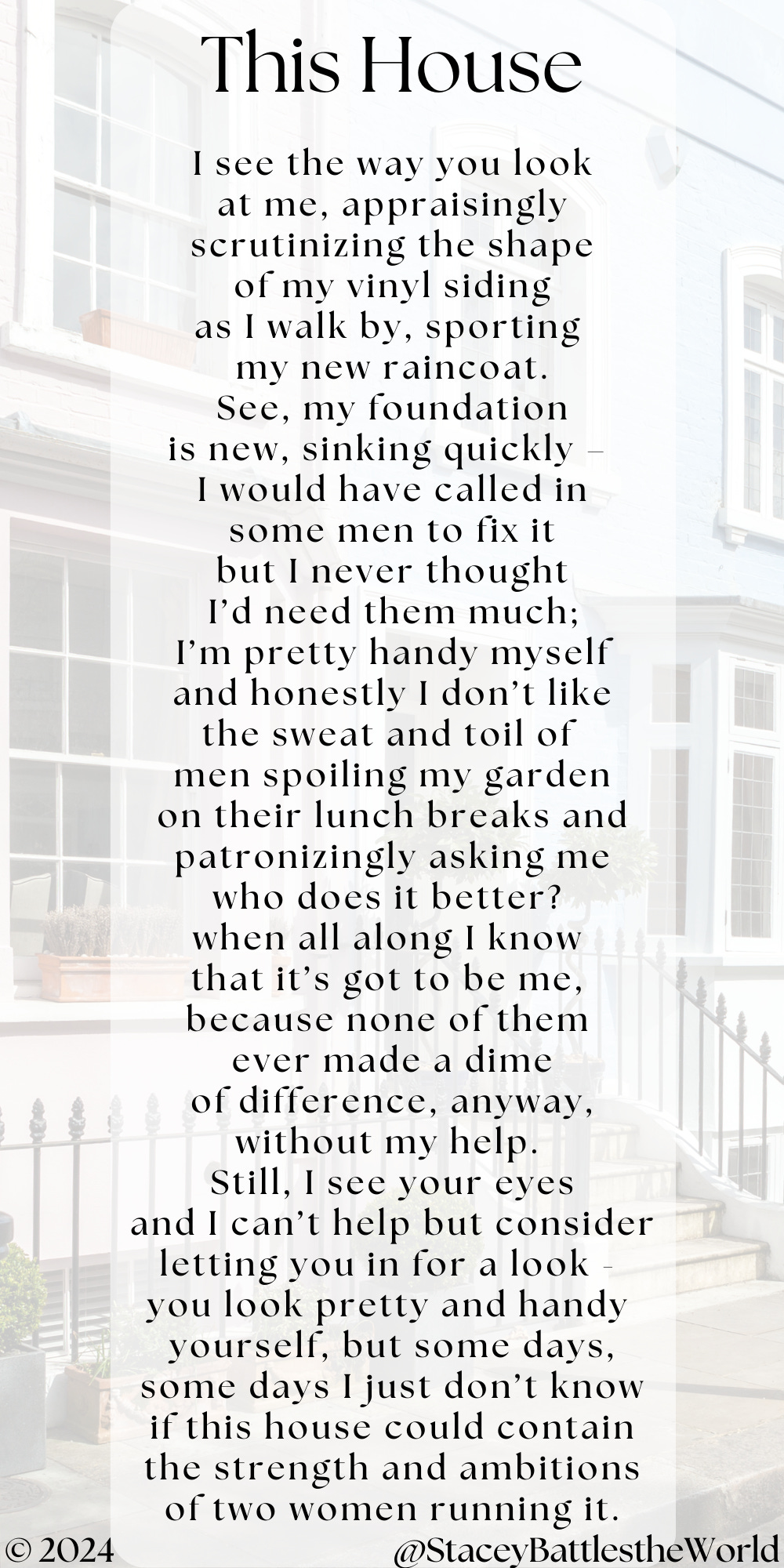 I see the way you look at me, appraisingly scrutinizing the shape of my vinyl siding as I walk by, sporting my new raincoat. See, my foundation is new, sinking quickly – I would have called in some men to fix it but I never thought I’d need them much; I’m pretty handy myself and honestly I don’t like the sweat and toil of men spoiling my garden on their lunch breaks and patronizingly asking me who does it better? when all along I know that it’s got to be me, because none of them ever made a dime of difference, anyway, without my help. Still, I see your eyes and I can’t help but consider letting you in for a look - you look pretty and handy yourself, but some days, some days I just don’t know if this house could contain the strength and ambitions of two women running it. © 2024 @StaceyBattlestheWorld