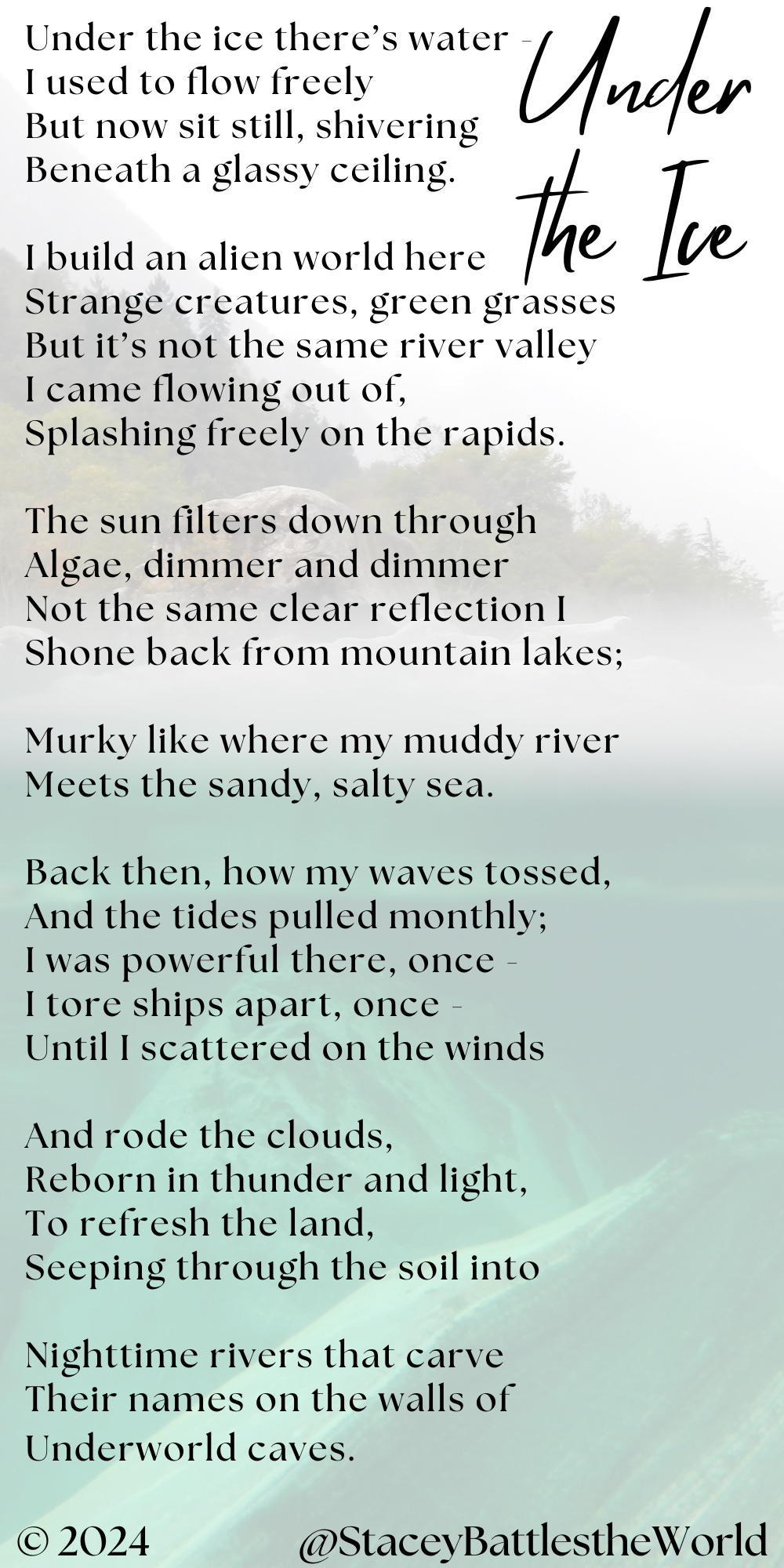 Under the ice there’s water - I used to flow freely But now sit still, shivering Beneath a glassy ceiling. I build an alien world here Strange creatures, green grasses But it’s not the same river valley I came flowing out of, Splashing freely on the rapids. The sun filters down through Algae, dimmer and dimmer Not the same clear reflection I Shone back from mountain lakes; Murky like where my muddy river Meets the sandy, salty sea. Back then, how my waves tossed, And the tides pulled monthly; I was powerful there, once - I tore ships apart, once - Until I scattered on the winds And rode the clouds, Reborn in thunder and light, To refresh the land, Seeping through the soil into Nighttime rivers that carve Their names on the walls of Underworld caves.