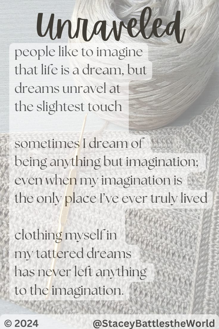 people like to imagine that life is a dream, but dreams unravel at the slightest touch sometimes I dream of being anything but imagination; even when my imagination is the only place I’ve ever truly lived clothing myself in my tattered dreams has never left anything to the imagination. ©2024 @StaceyBattlestheWorld