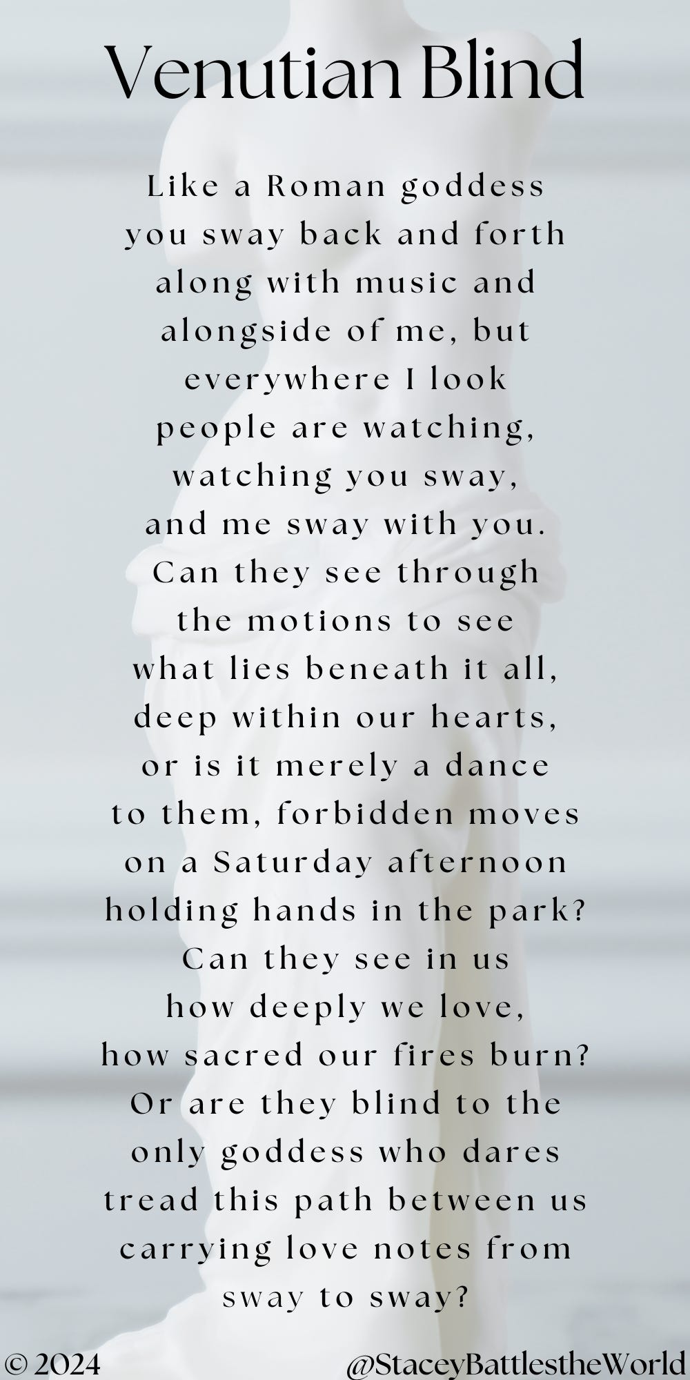 Like a Roman goddess you sway back and forth along with music and alongside of me, but everywhere I look people are watching, watching you sway, and me sway with you. Can they see through the motions to see what lies beneath it all, deep within our hearts, or is it merely a dance to them, forbidden moves on a Saturday afternoon holding hands in the park? Can they see in us how deeply we love, how sacred our fires burn? Or are they blind to the only goddess who dares tread this path between us carrying love notes from sway to sway? © 2024 @StaceyBattlestheWorld